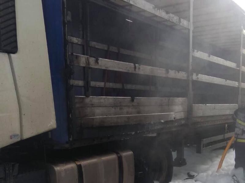 Огнем уничтожен автобус на площади 40 м²., обшивка прицепа и повреждена обшивка прицепа на площади 10 м²., два колеса, рама на площади 6 м²., два зеркала заднего вида большегрузного автомобиля «RENAULT». Спасены автомобиль и прицеп.