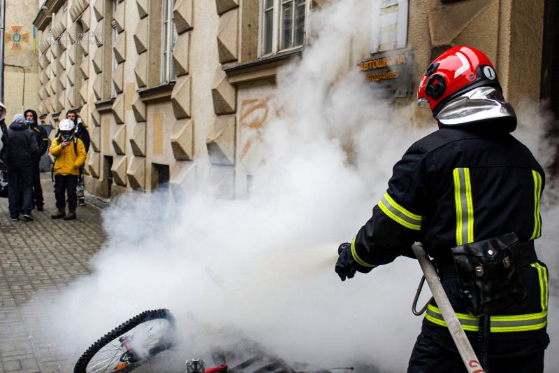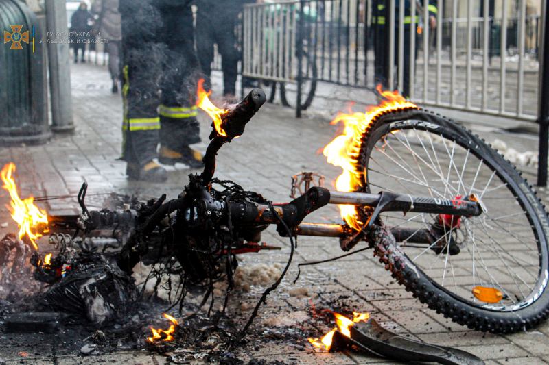 Пожежа виникла в електровелосипеді. До місця події виїхали рятувальники 1-ої державної пожежно-рятувальної частини м. Львова. На момент прибуття рятувальників до місця виклику електровелосипед був повністю охоплений вогнем.